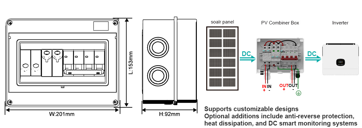 Standard models incorporate built-in fuses, surge protectors, circuit breakers, and other DC components, providing multiple protections against short circuits, overloads, and lightning strikes. Optional modules include smart monitoring, cooling, and anti-reverse functions