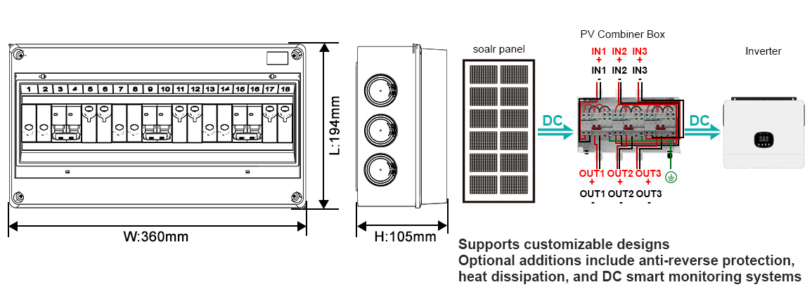 Standard models incorporate built-in fuses, surge protectors, circuit breakers, and other DC components, providing multiple protections against short circuits, overloads, and lightning strikes. Optional modules include smart monitoring, cooling, and anti-reverse functions
