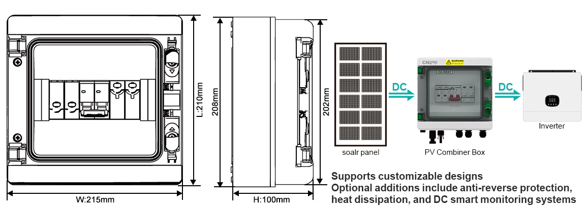 Specifically designed for circuit aggregation and protection between solar panels and inverters. Rated voltage: DC500V. Rated input current (Fuse): 1~32A. Rated output current (MCB): 16~125A. Supports multiple selectable input/output current specifications