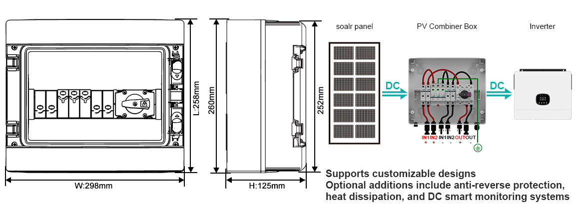 Specifically designed for circuit aggregation and protection between solar panels and inverters.The PV combiner box features a 2 in (2 PV strings) 1 out (1 inverter string) configuration. Rated voltage: DC1000V. Rated input current (Fuse): 1~32A. Rated output current (MCB or disconnect): 16~63A. Supports multiple selectable input/output current specifications