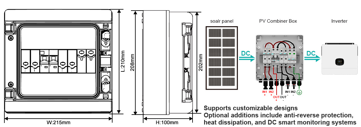 Specifically designed for circuit aggregation and protection between solar panels and inverters.The PV combiner box features a 2 in (2 PV strings) 1 out (1 inverter string) configuration. Rated voltage: DC600V. Rated input current (Fuse): 1~32A. Rated output current (MCB): 16~63A. Supports multiple selectable input/output current specifications