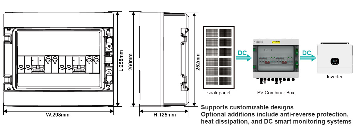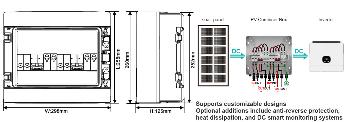 Specifically designed for circuit aggregation and protection between solar panels and inverters. The PV combiner box features a 2 in (2 PV strings) 2 out (2 inverter strings) configuration. Rated voltage: DC500V. Rated input current (Fuse): 1~32A. Rated output current (MCB): 16~125A. Supports multiple selectable input/output current specifications