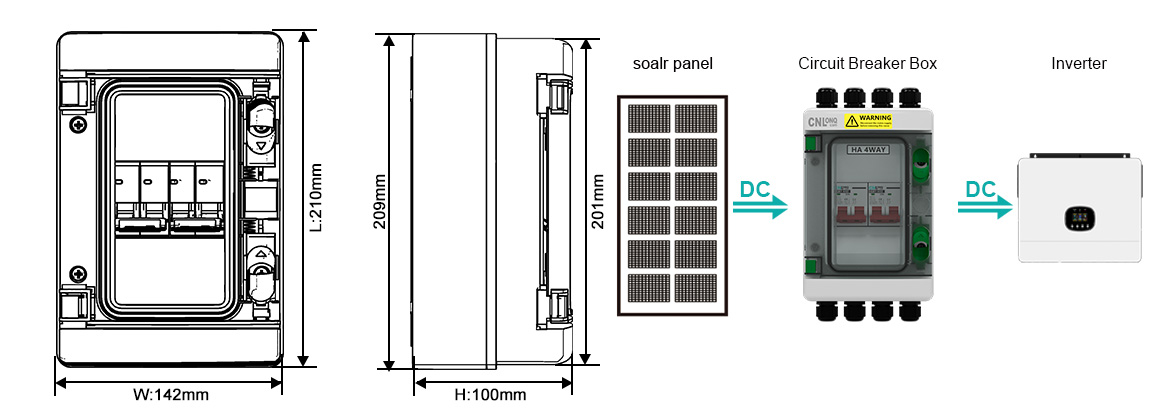 Specifically designed for circuit aggregation and protection between solar panels and inverters.The Circuit Breaker Box features a 2 in (2 PV strings) 2 out (2 inverter strings) configuration. Rated voltage: DC500V. Rated current: 16~125A.