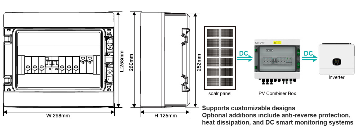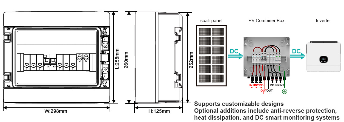 Specifically designed for circuit aggregation and protection between solar panels and inverters.The PV combiner box features a 3 in (3 PV strings) 1 out (1 inverter string) configuration. Rated voltage: DC600V. Rated input current (Fuse): 1~32A. Rated output current (MCB): 16~63A. Supports multiple selectable input/output current specifications