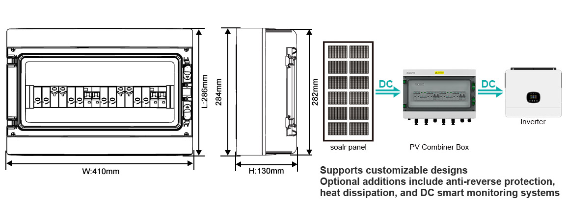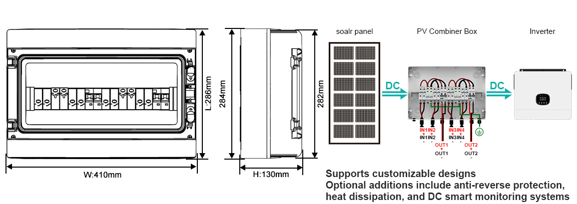 Specifically designed for circuit aggregation and protection between solar panels and inverters.The PV combiner box features a 4 in (4 PV strings) 2 out (2 inverter strings) configuration. Rated voltage: DC600V. Rated input current (Fuse): 1~32A. Rated output current (MCB): 16~63A. Supports multiple selectable input/output current specifications