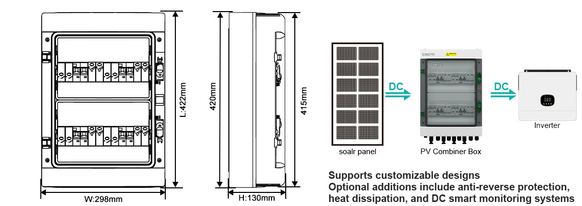Specifically designed for circuit aggregation and protection between solar panels and inverters.The PV combiner box features a 4 in (4 PV strings) 4 out (4 inverter strings) configuration. Rated voltage: DC600V. Rated input current (Fuse): 1~32A. Rated output current (MCB): 16~63A. Supports multiple selectable input/output current specifications