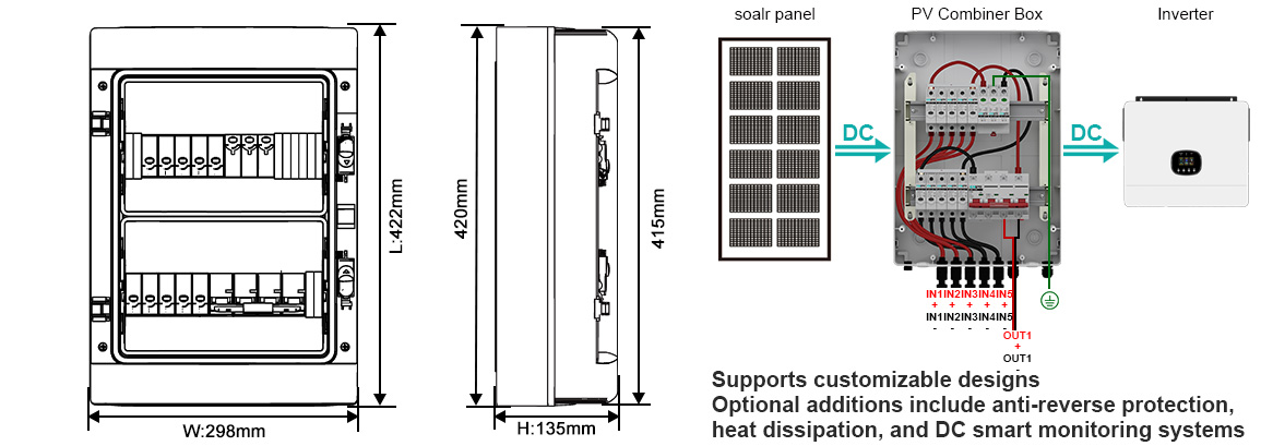 Specifically designed for circuit aggregation and protection between solar panels and inverters.The PV combiner box features a 5 in (5 PV strings) 1 out (1 inverter string) configuration. Rated voltage: DC1000V. Rated input current (Fuse): 1~32A. Rated output current (MCB): 16~125A. Supports multiple selectable input/output current specifications