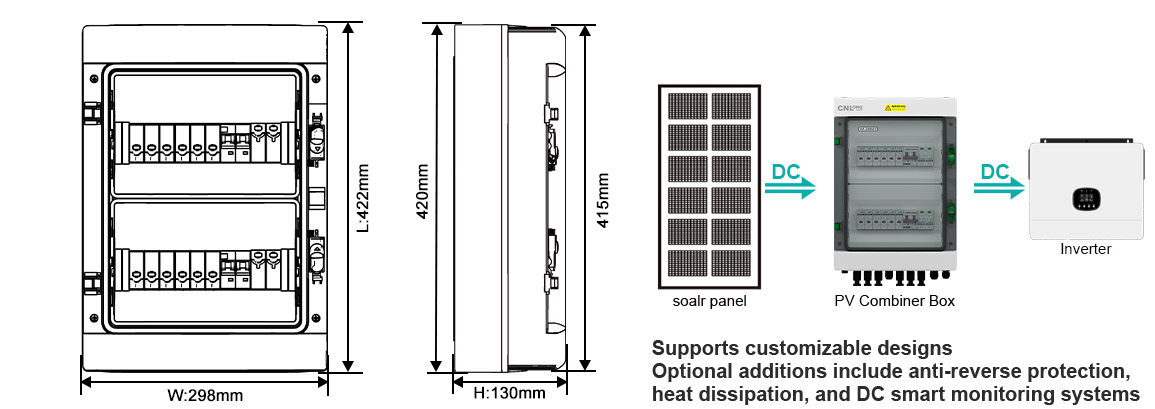 Specifically designed for circuit aggregation and protection between solar panels and inverters.The PV combiner box features a 6 in (6 PV strings) 2 out (2 inverter strings) configuration. Rated voltage: DC600V. Rated input current (Fuse): 1~32A. Rated output current (MCB): 16~63A. Supports multiple selectable input/output current specifications